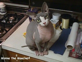 [ Yahoo's Haiku Pages | Back to My Main Page | Prophecy Sphynx (Minnie's Former Home) | More Kitty Pix! (www.ILoveMySphynx.com) | Email me ] Minnie is a Sphynx, a virtually hairless breed of cat.
